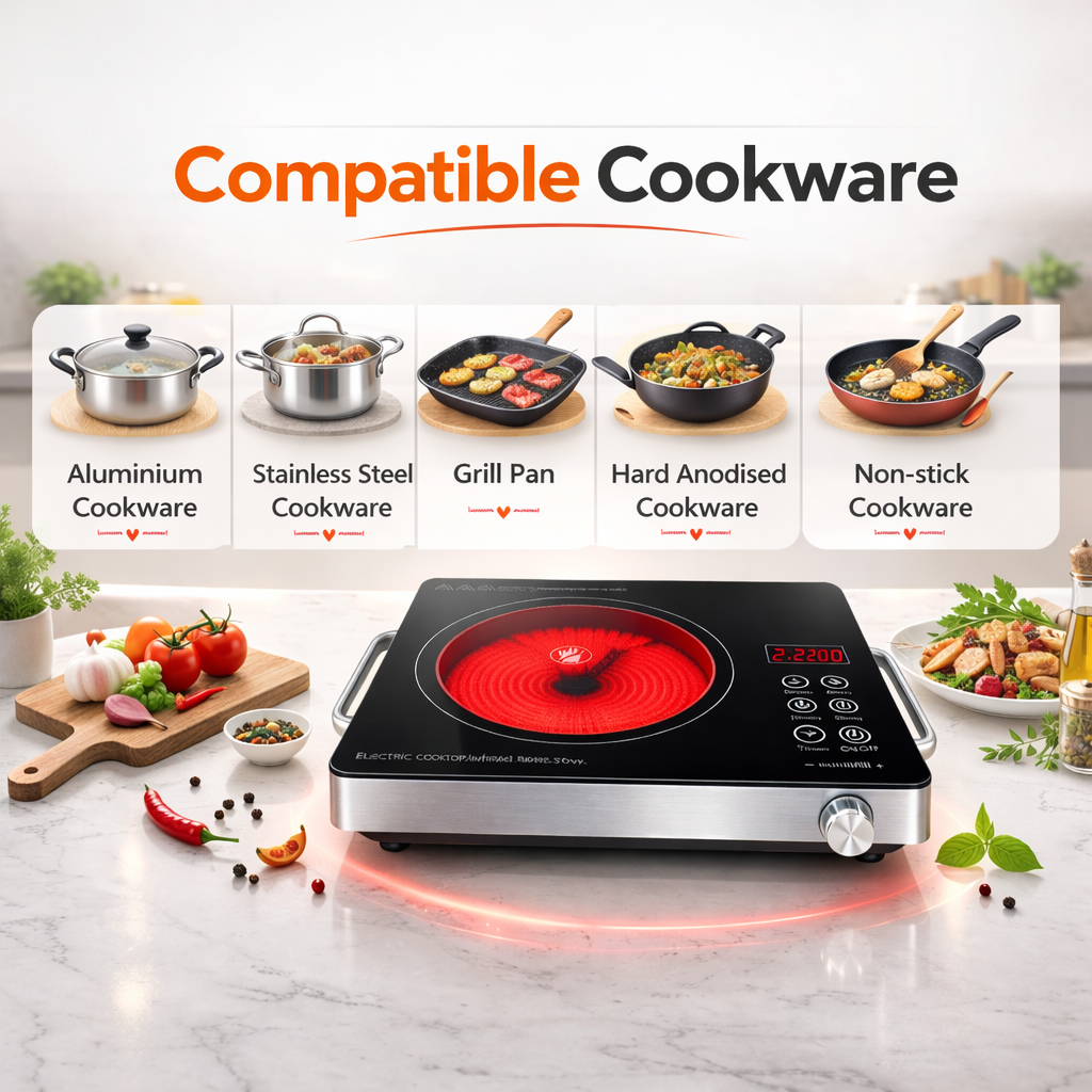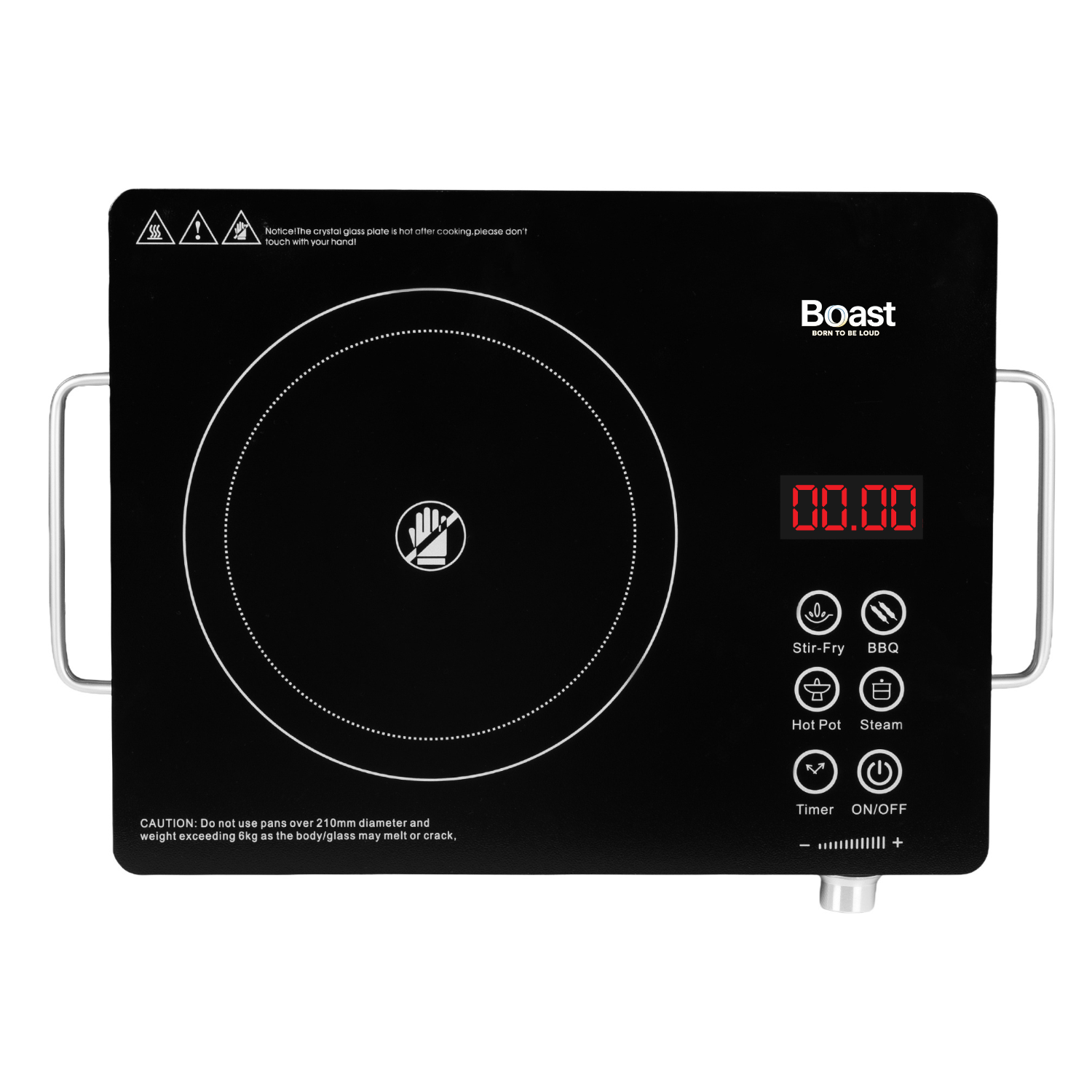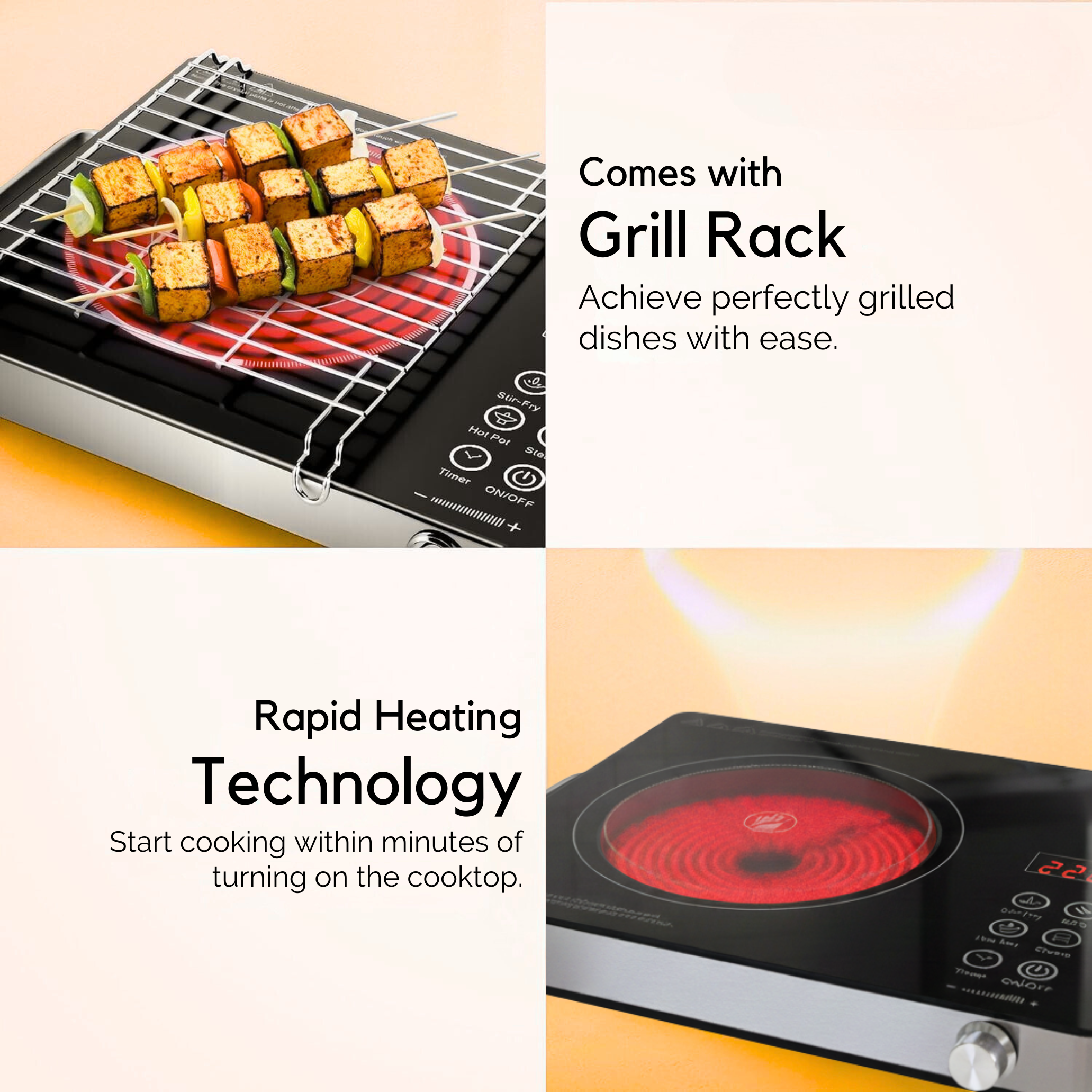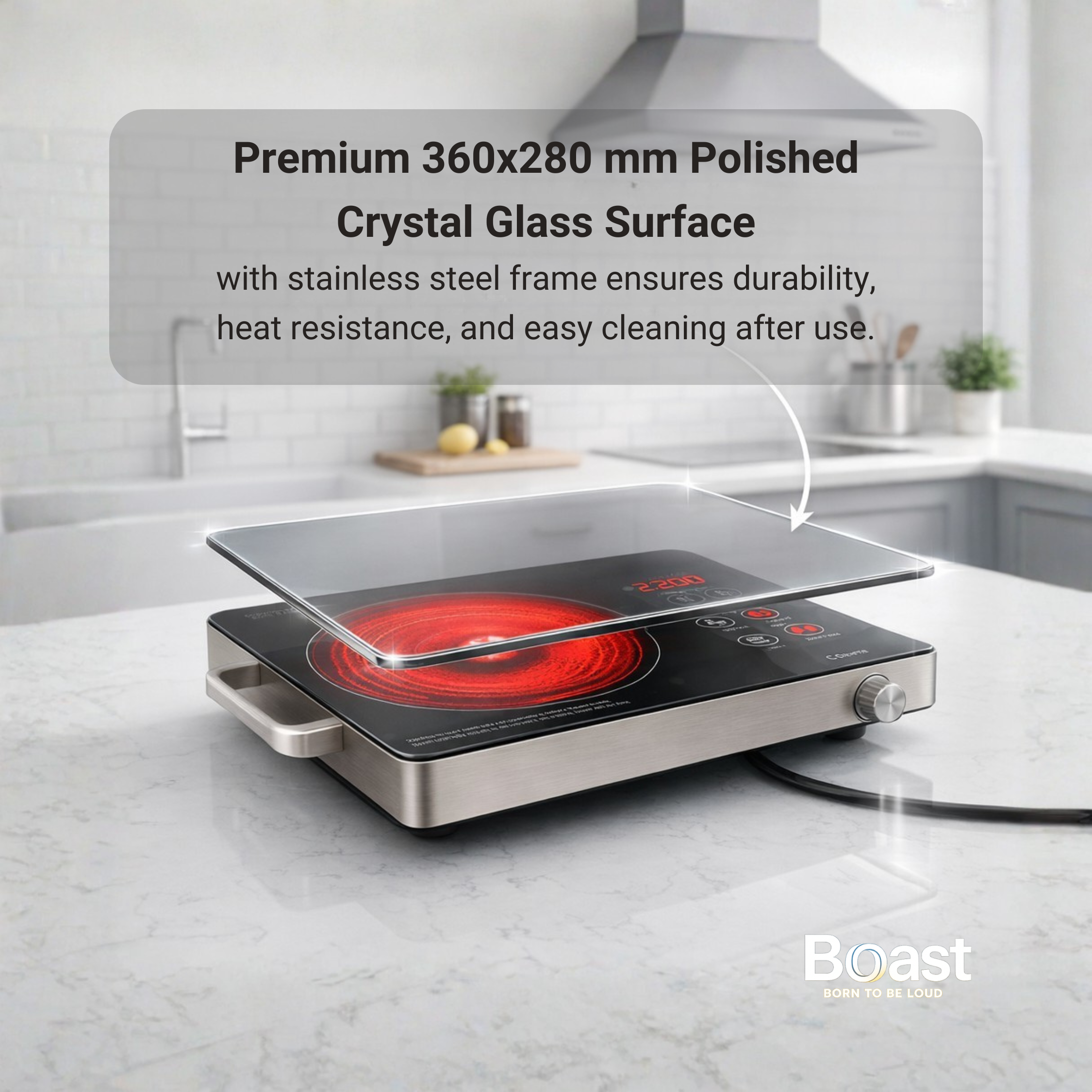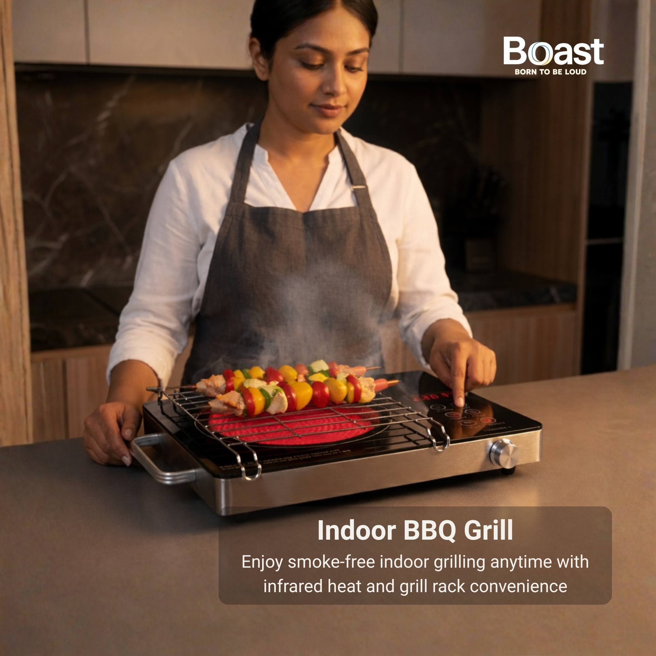 The Boast Agni Infrared Cooktop delivers powerful 2200W performance with a sleek crystal glass design, touch controls, and digital display for easy operation. It also features a grill rack for barbecue, multiple cooking modes, timer, and built-in surge protection for safe and versatile cooking.