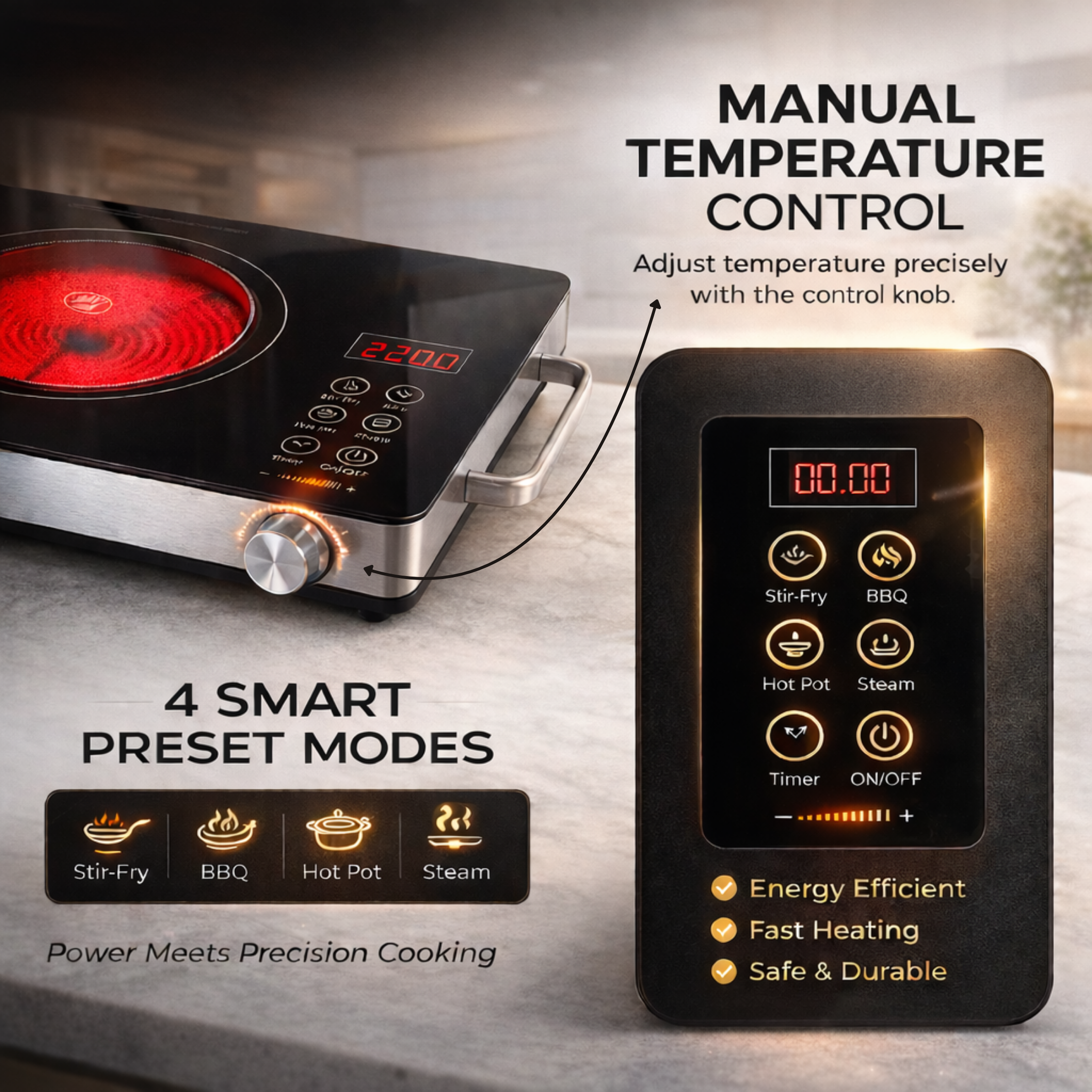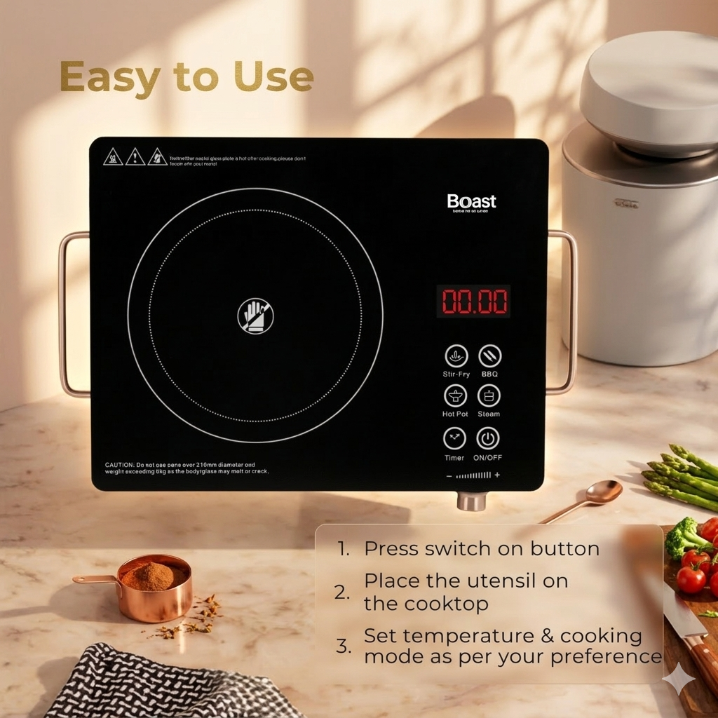 Equipped with responsive touch controls and a clear digital display, the cooktop allows effortless operation and precise control over cooking settings. It features 4 dedicated cooking modes to suit different recipes, along with a built-in timer for convenience and accuracy. For added safety, the cooktop comes with surge protection, making it reliable even during voltage fluctuations. Compact, stylish, and highly functional, the Boast Agni Infrared Cooktop is perfect for hassle-free indoor cooking.